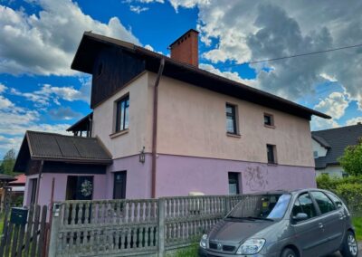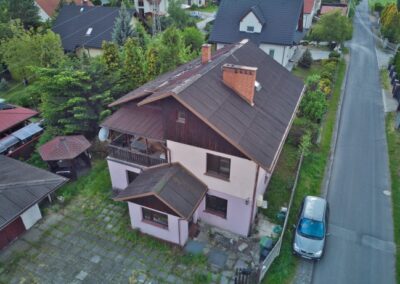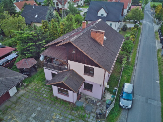Budynek mieszkalny o powierzchni ogólnej kondygnacji nadziemnych 148 m², w zabudowie wolnostojącej, piętrowy z poddaszem, niepodpiwniczony, murowany, dach dwuspadowy o konstrukcji drewnianej, pokryty onduliną (częściowo zerwane pokrycie). Budynek wybudowany w latach 80-tych, niezamieszkany. Układ funkcjonalny: parter: wiatrołap, korytarz, klatka schodowa, kuchnia, kotłownia, łazienka, 2 pokoje; piętro: klatka schodowa, korytarz, schowek, łazienka, 3 pokoje, poddasze: pom. dostępne ze schodów drabiniastych do adaptacji. Stan techniczno-użytkowy ocenia się jako poniżej przeciętnego w kontekście badanego zbioru nieruchomości porównawczych. Budynek o nieszczelnym pokryciu dachowym, zalane i zapleśniałe pomieszczenia na I piętrze.